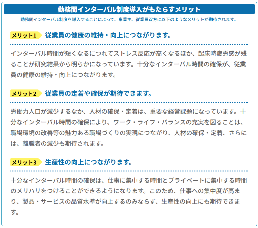 働く人の生活時間や睡眠時間を確保し、健康な生活を送るため有効な制度です。