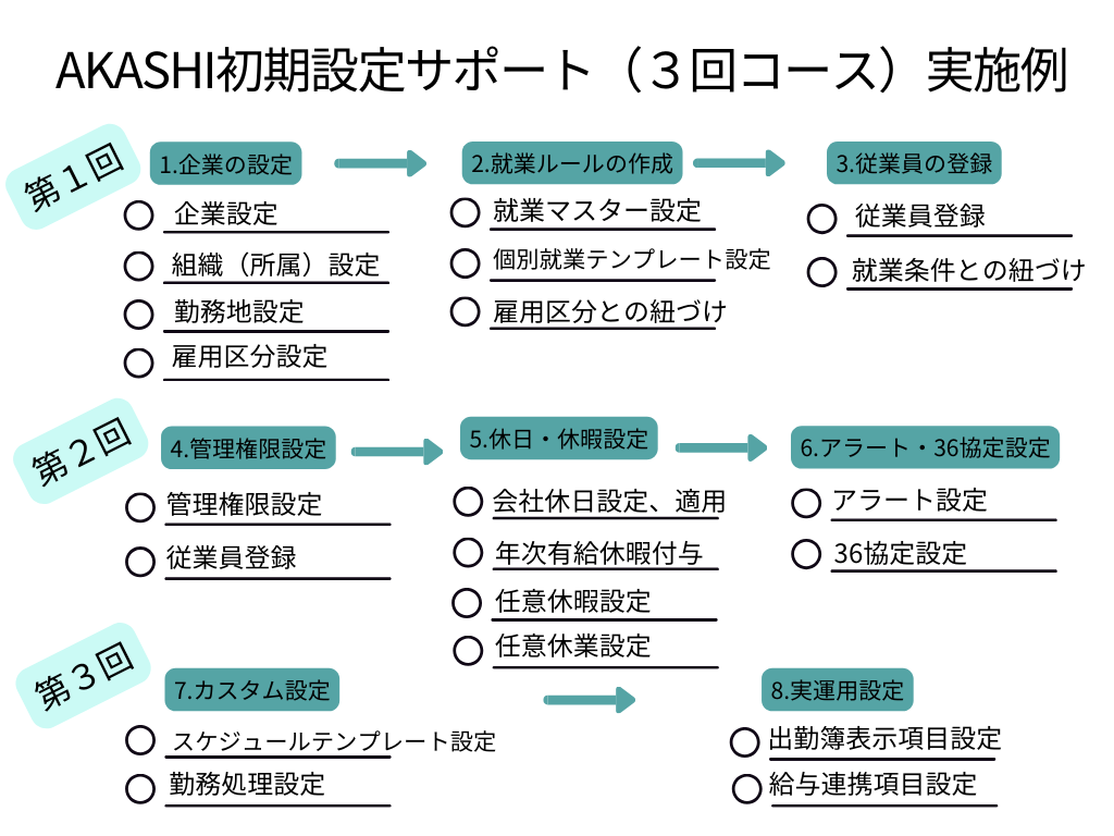 どんなに忙しい方でも、1回2時間の初期設定サポートの時間の中で可能な限り、組織、労働条件、従業員、休暇、36協定、アラートなど基本設定を進めて頂くことができます。